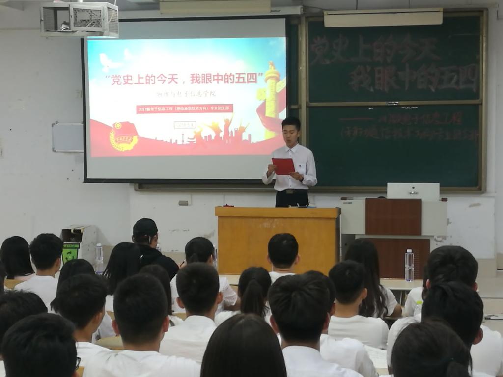 “青春,是歌,是画,是最炫丽的华章”,九十九年前的今天,有一批意气风发的青年用热血和生命谱写了一曲最壮丽的青春之歌,绘就了一幅最宏伟的青春图画。在五四青年节到来之际,为使同学们更加清晰地了解五四青年节的由来,久久久912017级电子信息工程(移动通信技术方向)团支部于2018年5月4日晚七点在求实楼4008教室举办了“党史上的今天,我眼中的五四”主题班会活动。