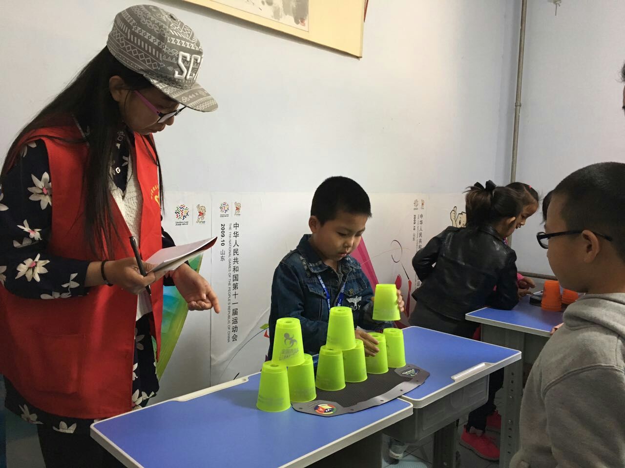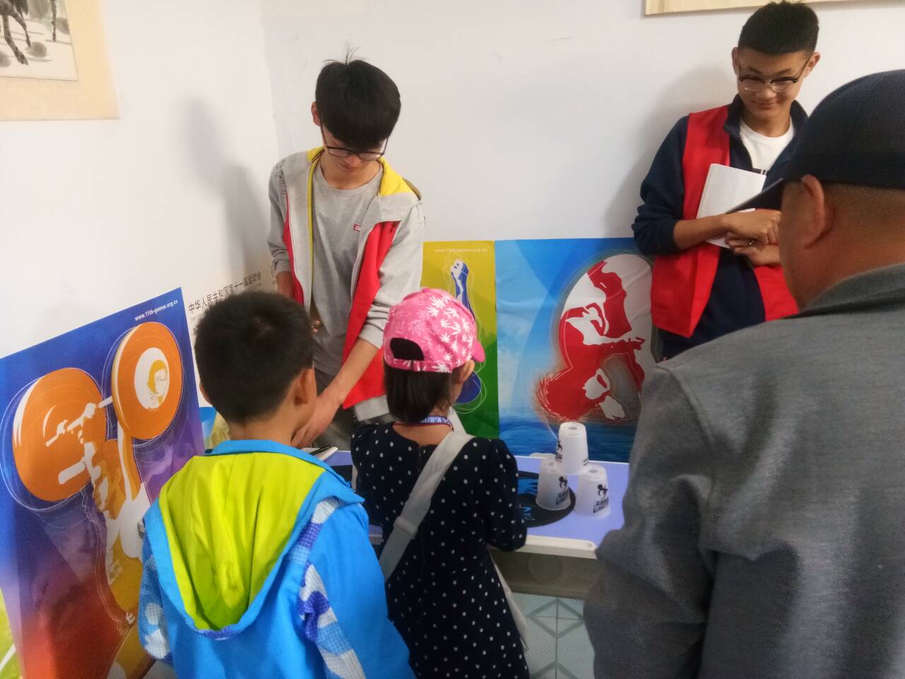 运动会开始前,物电学院青年志愿者对德州晚报小记者们进行了叠杯子的培训,教给他们最基本的叠杯子方法,小记者们热情高涨,很快就掌握了要领。随后,德州晚报小记者飞叠杯"益智运动会正式开始,小记者们在了解规则后开始自己的表演,小记者们仔细观察杯子,认真思考保证杯子不歪倒的摆法,不断的尝试,并快速的完成了比赛,小记者们面对自己努力的成果露出了满意的表情,最后,根据完成比赛时间的长短,统计出小记者们的名次并为其颁发了奖品,没有获奖的小记者也给予小礼物以资鼓励。