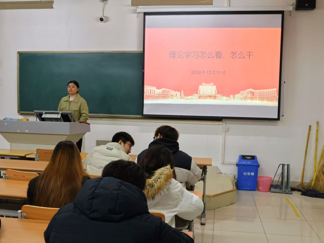 12月11日,物电学院在明理楼0215教室开展“理论学习怎么看、怎么干”主题培训活动,学院党委副书记刘秀华讲述了学思用贯通和知信行统一的理论学习方法,并就大学生就业指导工作与参会学生展开研讨。最后,刘书记勉励全体学员要持续学习、持续奋斗,为全面建设社会主义现代化国家贡献物电力量。