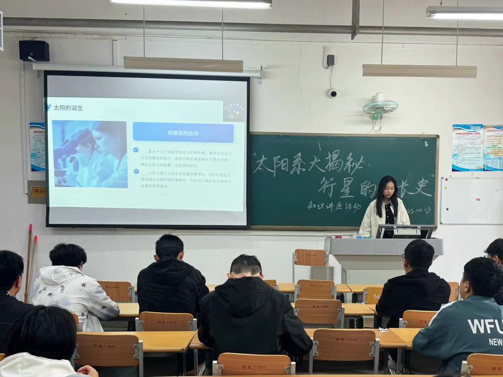 为普及天文知识,激发青年学子对宇宙探索的热情,物电学院天文爱好者协会于4月8日在明理楼118教室成功举办“太阳系大揭秘,行星的成长史”主题科普活动。