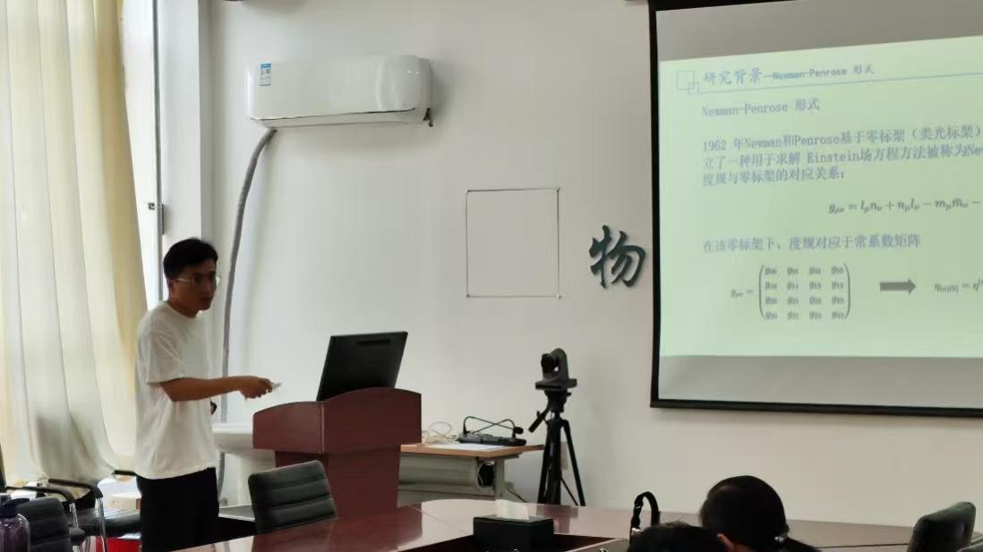 郭亚博士主要从事引力波、电磁波等在不同引力场中的传播规律研究。在报告中,郭博士详细介绍了引力波、电磁波等不同自旋场在球对称与轴对称背景时空中的传播问题,然后基于 Newman-Penrose 形式建立并解耦了相应的引力波方程,进一步分析了形变 Kerr 背景下径向方程的奇异性。