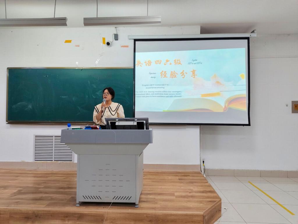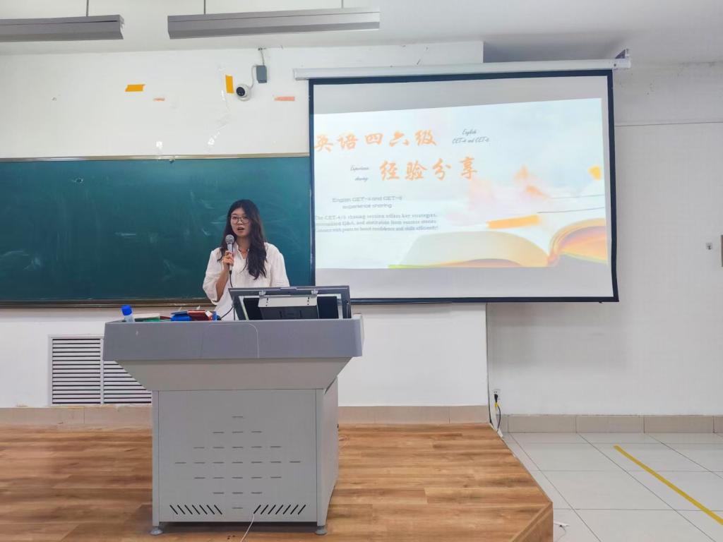 活动中,主持人吴秋语首先强调英语四六级考试在考研升学、求职就业及个人能力提升中的重要性,迅速聚焦全场注意力。随后,22级工程专业史立莹、张彩琳,22级互联专业王倚珂,23级工程专业侯馨凝四位主讲人依次分享备考经验,内容涵盖时间规划、资料筛选、题型专攻(听力/阅读/写作/翻译)、心态调整及应试技巧等核心板块。讲解过程中,主讲人结合具体真题案例演示解题思路,同学们专注聆听、认真记录,现场学习氛围浓厚。在互动环节,同学们就“听力卡顿应对”“写作思路拓展”等备考难点踊跃提问,主讲人结合自身经验逐一给出针对性建议。