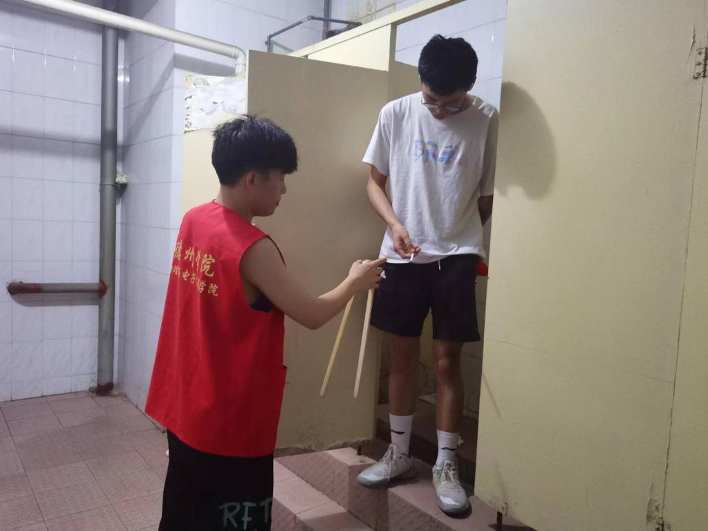 我院首先建立了两支宿舍禁烟服务队与一支教学楼禁烟服务队,每支服务队5人。由负责人分好组之后进行禁烟大排查。服务队成员利用空课、周末以及每天晚上不定时去厕所、楼道处进行吸烟情况的检查和记录,并对吸烟者进行劝导。每一位成员兢兢业业,仔细排查厕所内的烟头,并进行捡拾。志愿者们发现吸烟者后,对其进行及时劝阻,吸烟者也表示认真反思,深刻检讨。