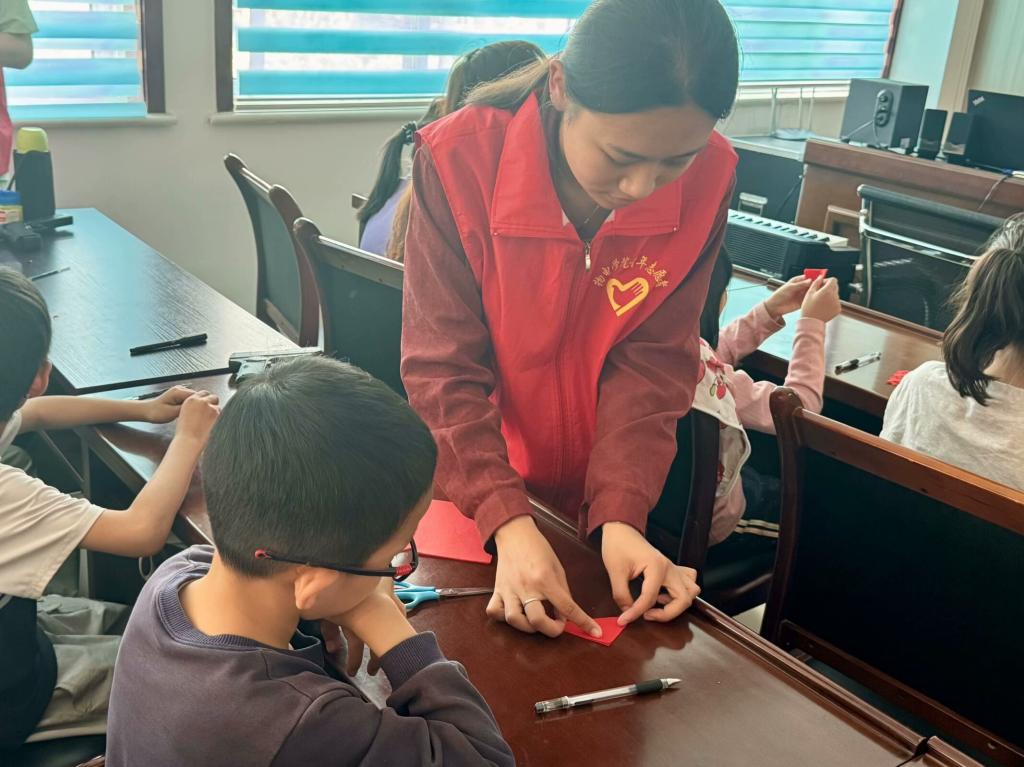 活动伊始,志愿者们以生动有趣的讲解,向小朋友们介绍了五四运动的历史背景、重要意义以及五四精神的内涵。随后,进入了剪纸创作环节,志愿者们拿出提前准备好的工具,耐心地向小朋友们传授剪纸的基本技巧。志愿者们细致入微的讲解,让复杂的剪纸步骤变得简单易懂。在志愿者们的指导下,小朋友们尝试着剪出与五四精神相关的图案——鲜红的五角星、展翅的和平鸽、奋进的青年剪影,成为五四精神与传统文化碰撞出的最美火花。百年前的青年理想与新时代的文化传承完成了跨越时空的对话,“爱国、进步、民主、科学”的精神火种也悄然播撒在小朋友们的心灵深处。