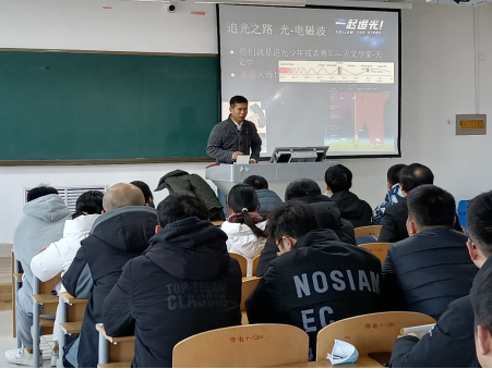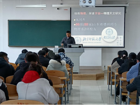 张同杰教授1988年毕业于山东省德州师专物理系,现在北京师范大学天文系工作。交流会上张教授结合自身的科研学术成果与自身求学经历,给师生们作了精彩的学术报告并针对毕业生即将面临的研究生复试与未来的学习科研生活提出了中肯的建议。会后师生们就此次交流会自身还存在的疑问与张教授进行了讨论。