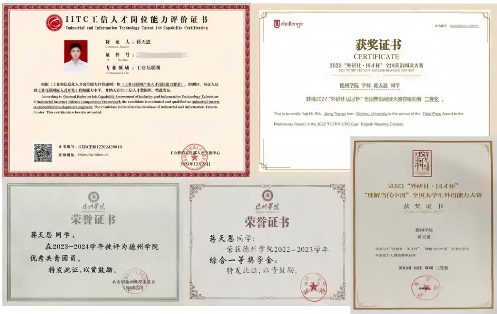 蒋天恩在学习上一直刻苦钻研,对电子信息学院专业有着深刻而独到的见解。他认为,该专业不仅跨越多个学科领域,而且承载着技术革新和社会发展的双重使命。所以他在学习上有着明确的目标,踏实肯干,在2023-2024学年学业成绩3门课程期末笔试取得满分,31门课程取得优秀(90+)。他重视课外学习,同时考取了嵌入式工程师证书、普通话证书等。