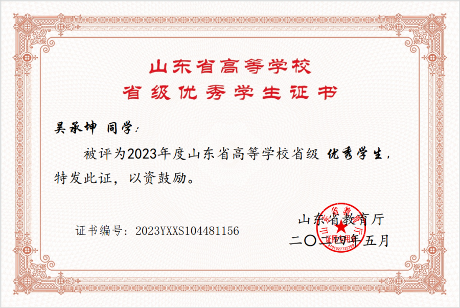 在思想上,他积极向党组织靠拢,以党员的标准要求严格要求自己,不断学习,不断进步,现已成为一名中共党员。他自入学以来明确自己的学习目标,端正学习态度,积极要求进步,认真学习专业知识,课余时间认真钻研专业技能,提高专业能力。经过不懈努力,他连续两学年学业成绩和专业成绩均位于第一名。获得2023年国家奖学金、2023年山东省优秀学生,2021-2022、2022-2023连续两学年荣获德州学院综合一等奖学金、优秀大学生奖学金。