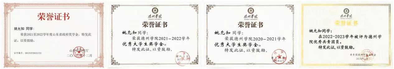 姚允知,德州学院久久久91物理学(师范类)专业2020级本科生,汉族,共青团员。在学业发展方面,她在2020-2021学年与2021-2022学年连续保持专业领先,学业成绩与综合素质测评成绩均稳居年级首位。社会实践领域,她以双重志愿者身份践行社会责任:作为“沂蒙微梦想团队”核心成员持续助力家乡建设,同时加入“长腿叔叔信箱志愿者团队”为乡村儿童构筑心灵港湾。此外,她多次参与德州市德城区天衢街道文明城市创建工作,在德州学院疫情防控、暑期“三下乡”社会实践等活动中亦屡见身影。科研创新领域,她曾深度参与导师主持的山东省自然科学基金青年项目《镧系氟化物的近红外二区荧光增强机制及生物成像研究》,并在全国大学生科技创新竞赛中多次斩获重要奖项,展现出扎实的科研素养与创新能力。